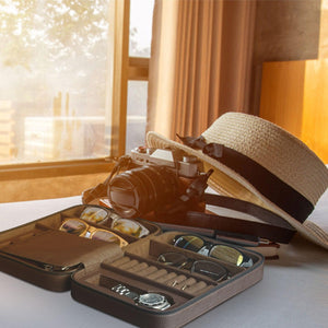 The Lifestyle Saffiano Braun watch case is the ultimate expression of refinement and excellence. Designed to securely and stylishly store your watches, jewelry, and sunglasses. It is the perfect choice for watch, jewelry, and sunglasses enthusiasts who want to protect their investments while displaying a sophisticated style.